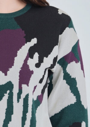 This abstract green knit sweater offers a fresh take on casual wear with its vibrant shade and creative pattern. It’s a striking piece that channels the energy of spring and the tranquility of green, perfect for those looking to refresh their seasonal wardrobe.