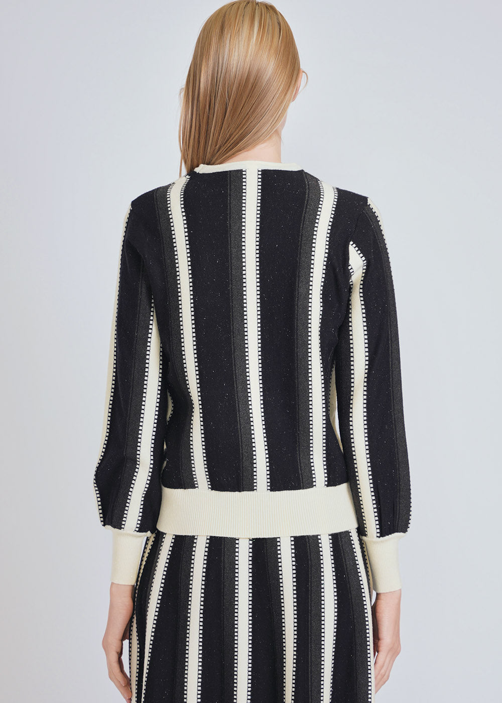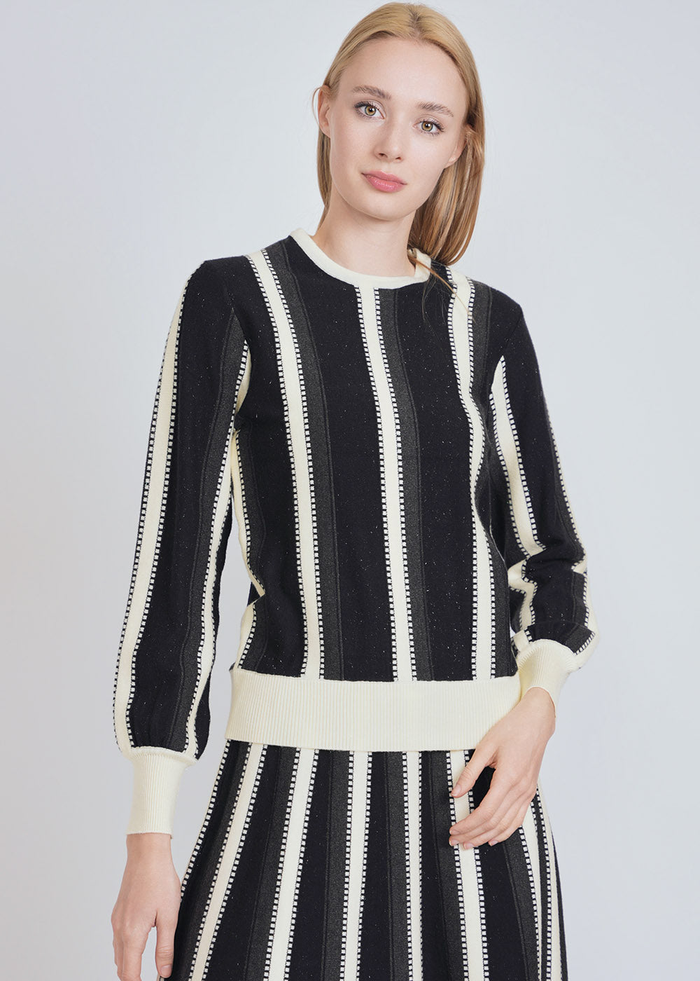 A modern knit top with contrasting white accents that create a sleek, streamlined look. Ideal for professional or casual settings.