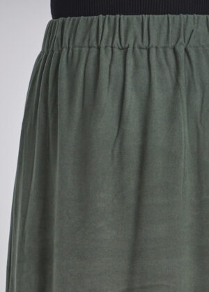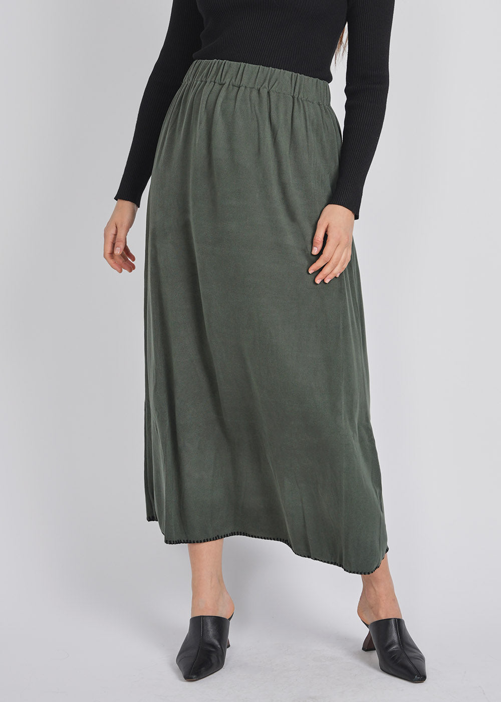 - This green skirt presents a classic silhouette with a modern twist, featuring a black stitch detail. It’s perfect for those who appreciate a minimalist aesthetic.